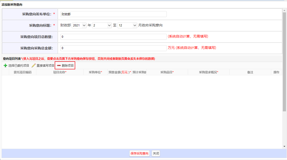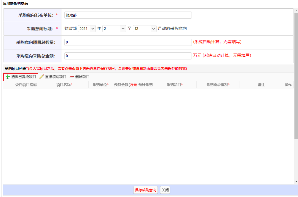 - 添加完项目信息后,需在【采购意向】页面点击下方“保存采购意向”按钮,请勿关闭或刷新页面,否则数据将会丢失,需重新录入。