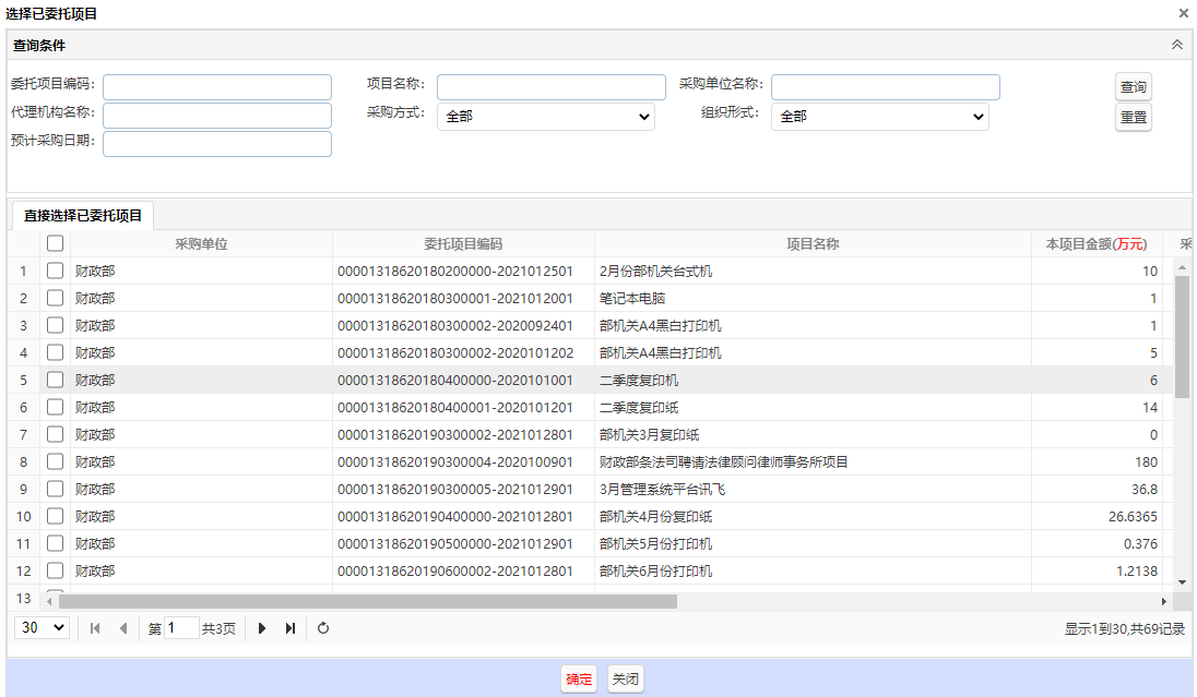 选择已委托项目是指在采购计划系统进行过委托的项目,委托之后在意向系统关联选择,系统将带出部分信息。