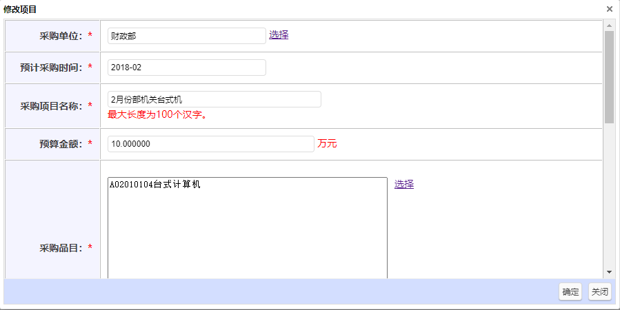 点击选择,然后勾选项目采购品目(最多选择100个品目),选择完成后点击确定完成品目选择。也可以按照品目编码或者品目名称筛选。